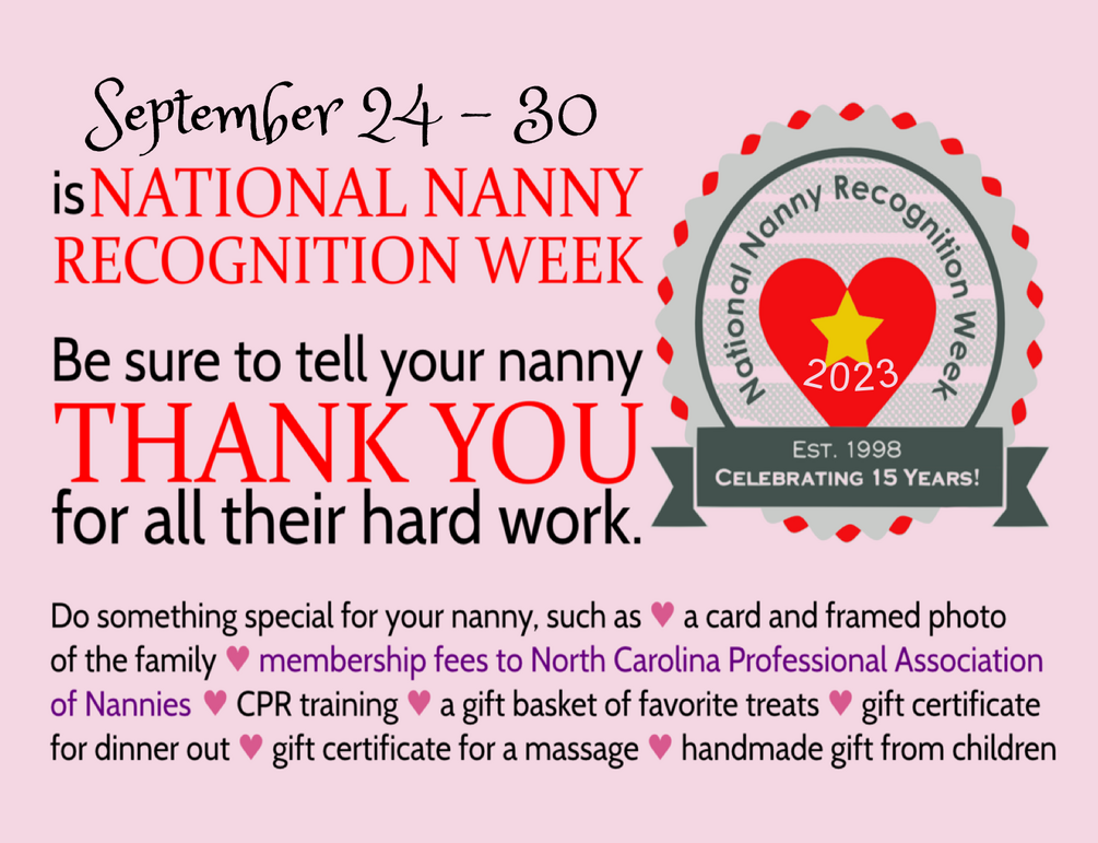 There are many ways to inform your employers about National Nanny Recognition week, such as sending your own letter to your employers. The North Carolina Professional Association of Nannies provides annual postcards to employer families making them aware of National Nanny Recognition Week. For the cost of a postcard stamp, you can anonymously inform your employers of National Nanny Recognition Week, because we know that directly asking to be recognized can feel demanding.