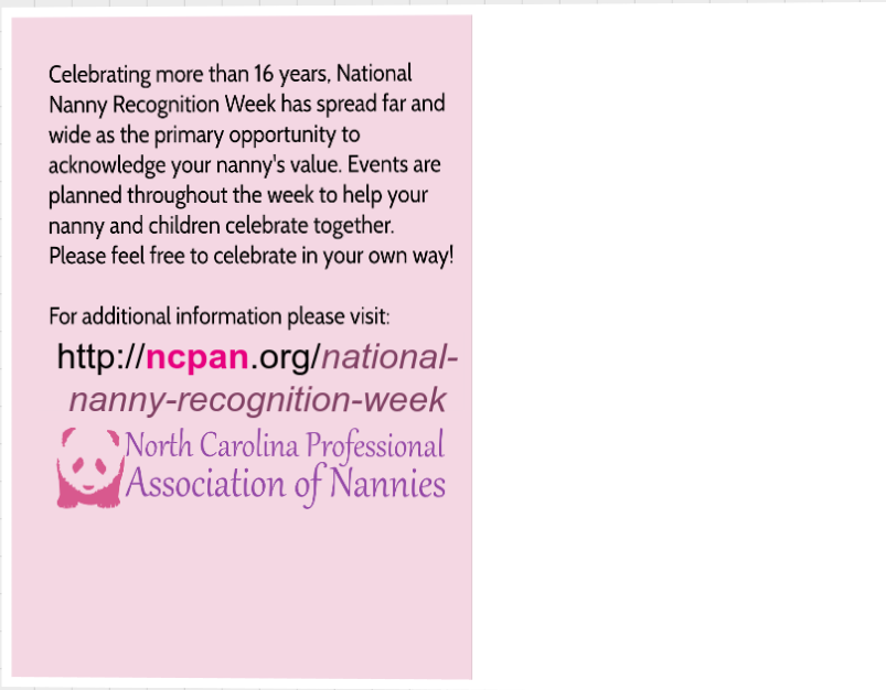 The North Carolina Professional Association of Nannies offers annual postcards to educate employer families about this event. The postcards are for you to print at two per sheet, with instructions available for assembly.